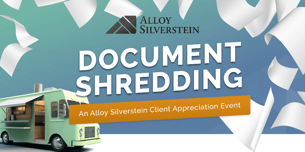 On May 10, 2025, Alloy Silverstein hosted a Document Shredding Event to show our clients how much we appreciate them and to help practice safe record retention and disposal. Featuring a professional shredding truck and a local food truck, clients dropped off documents via drive-thru for safe shredding and then joined our team for a snack, lunch or a sweet treat from the Madison Pub food truck.